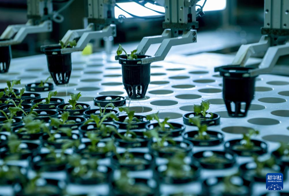 在新一代自動化無人植物工廠,智能機器人進行自動化生產(5月8日攝)。