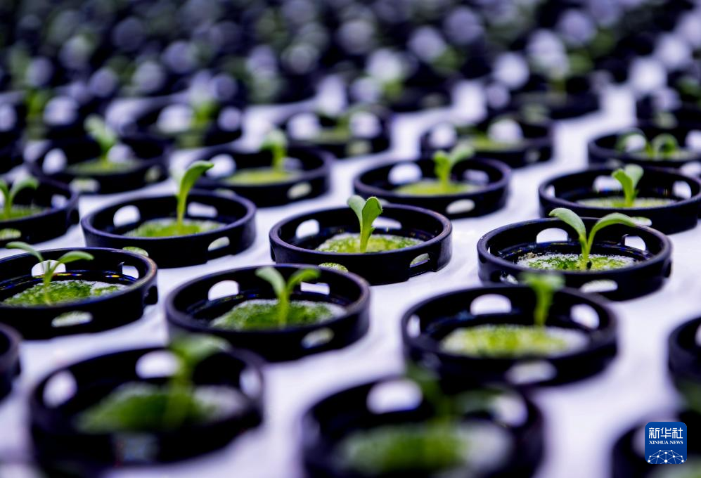生菜種子在特殊的LED燈照射下成長(5月8日攝)。