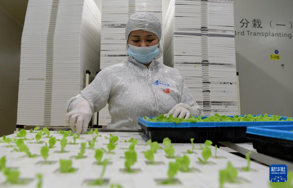 工作人員為生菜苗進行分栽(5月8日攝)。