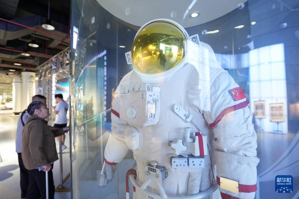 5月10日,在位于北京航空航天大學的北京航空航天博物館內,參觀者參觀展出的神舟七號艙外航天服。