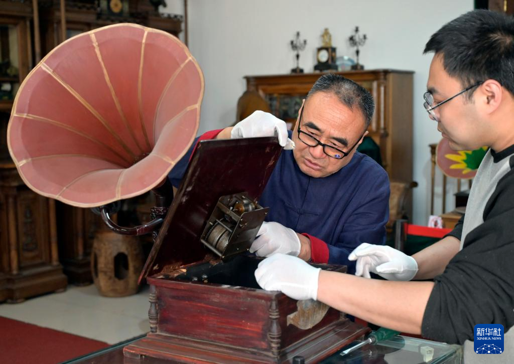 5月17日,在旅順留聲機博物館,老館長王心偉(左)帶著兒子王子鳴保養老留聲機。