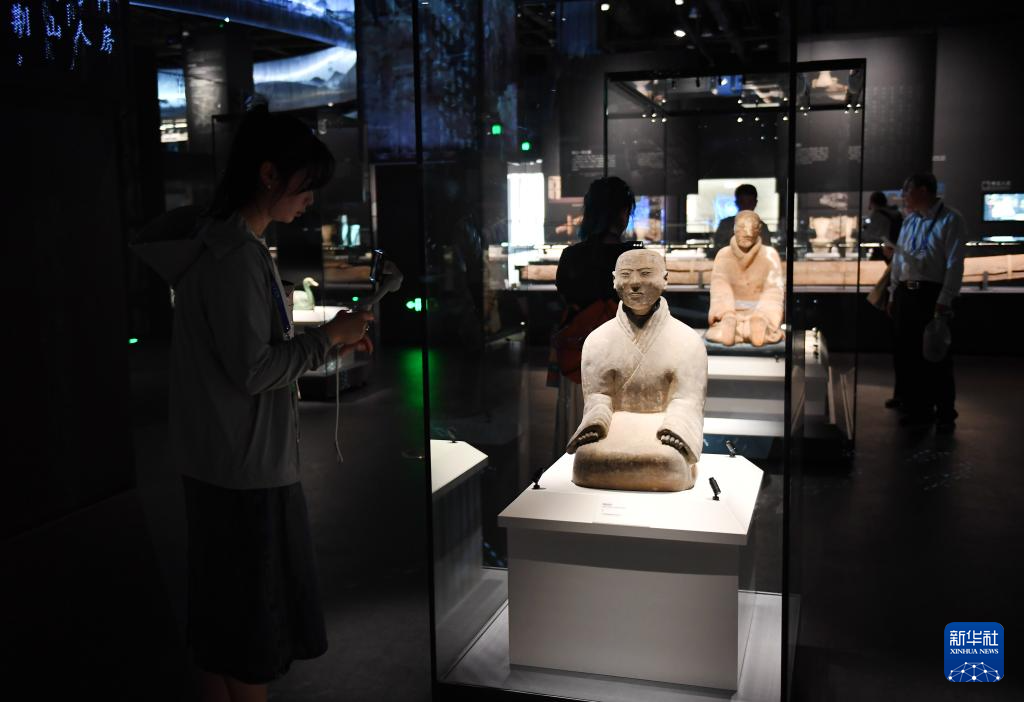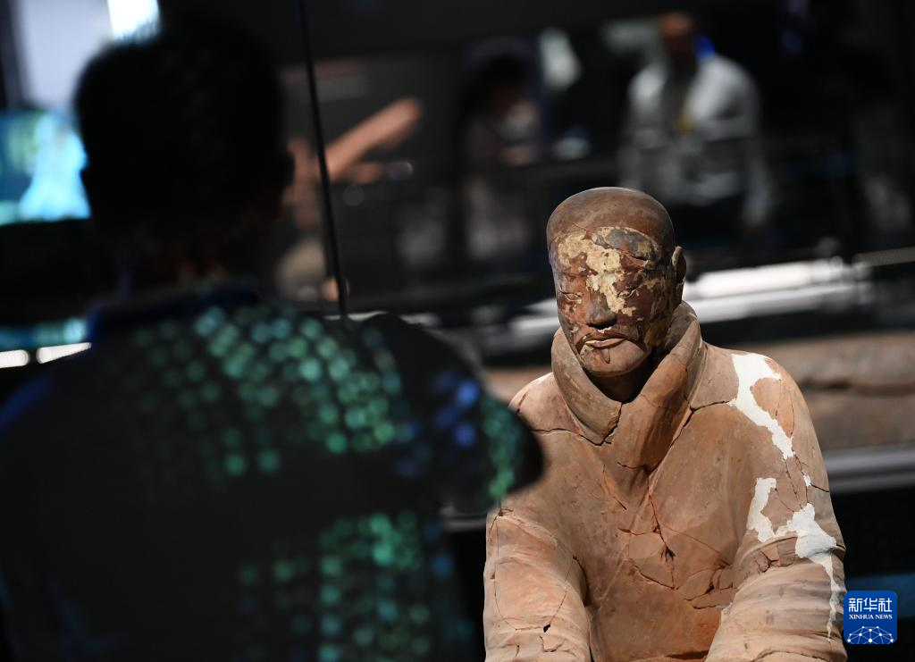 5月18日,觀眾在陜西歷史博物館秦漢館觀看“城與陵”專題陳列上展出的秦代跽坐俑。