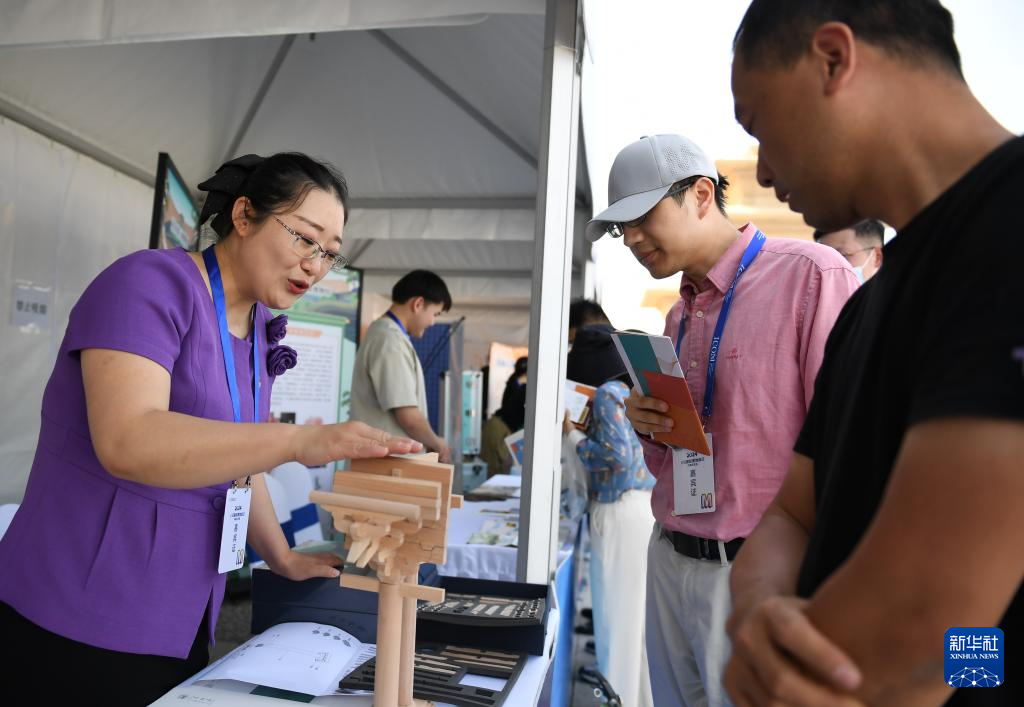 5月18日,在陜西歷史博物館秦漢館舉行的2024年國際博物館日中國主會場活動上,山西博物院工作人員(左一)為觀眾介紹斗拱模型文創產品。