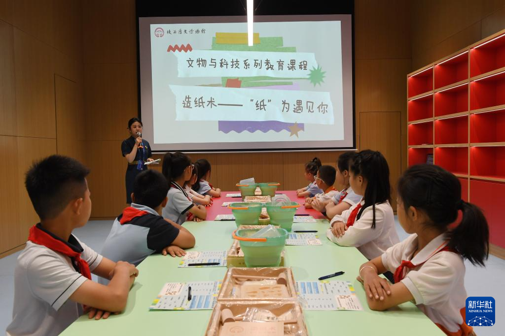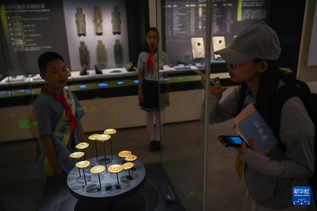 5月18日,小學生在陜西歷史博物館秦漢館參加“文物與科技”系列教育課程。