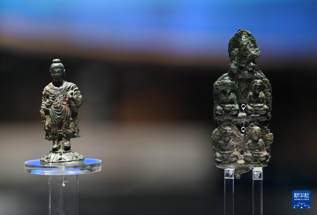 5月18日在陜西歷史博物館秦漢館“天下同一——秦漢文明主題展”上拍攝的東漢金銅佛像。