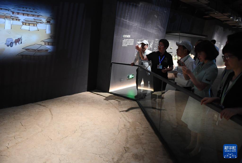5月18日,在陜西歷史博物館秦漢館,陜西歷史博物館陳列展覽部主任任雪莉(左二)為觀眾講解“城與陵”專題陳列上展出的秦代道路遺跡。