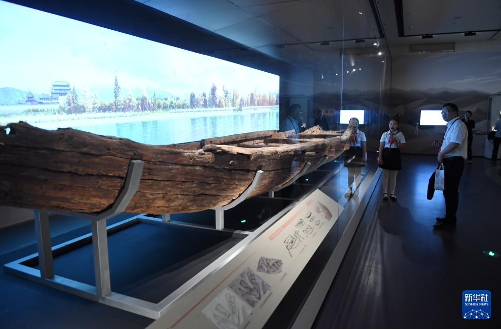 5月18日,觀眾在陜西歷史博物館秦漢館觀看“天下同一——秦漢文明主題展”上展出的漢代古船“絲路一號”。