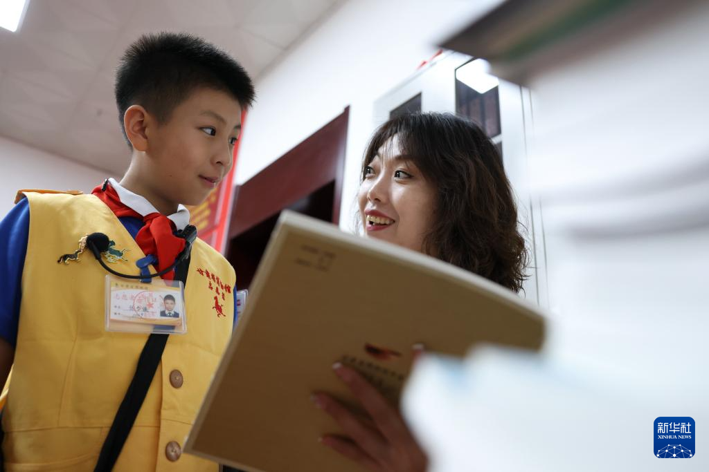 張書鋮(左)在甘肅省博物館志愿者總站和指導老師劉婷交流(5月28日攝)。