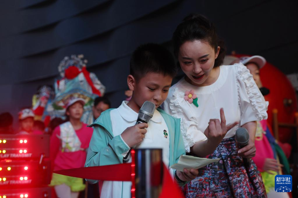 張書鋮(前左)和主持人郟捷在中央廣播電視總臺“六一”晚會節目錄制現場做彩排前準備(5月23日攝)。