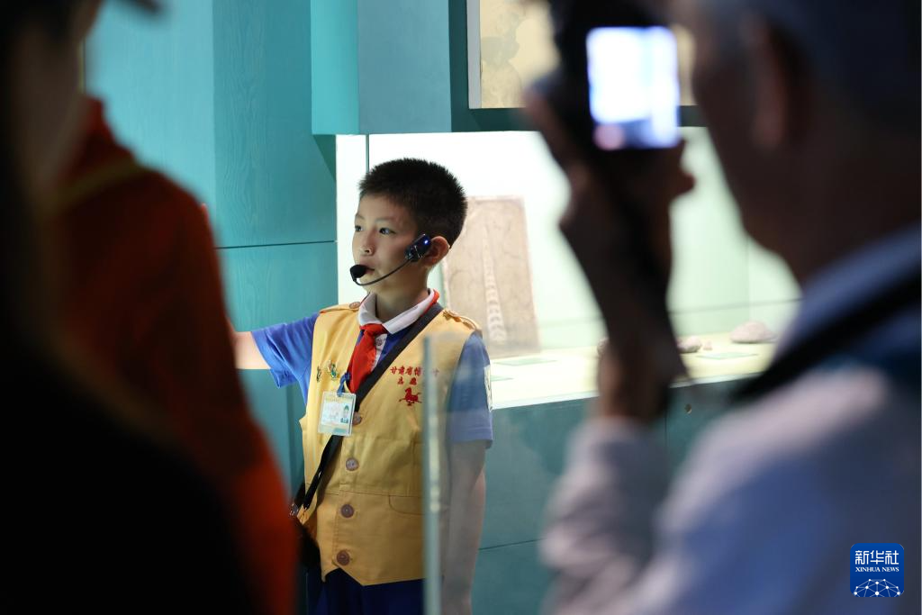 身穿黃色志愿者小馬甲,佩戴好擴音器,今年9歲的甘肅省博物館講解員張書鋮從容走進展廳。他字正腔圓的講解和落落大方的談吐吸引了不少游客駐足贊嘆。