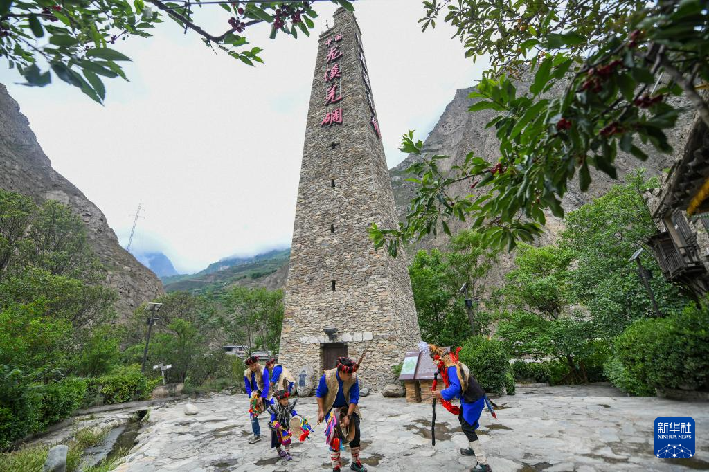 5月29日,在汶川縣灞州鎮聯合村,小耶格和長輩們在村里的碉樓下跳羊皮鼓舞。