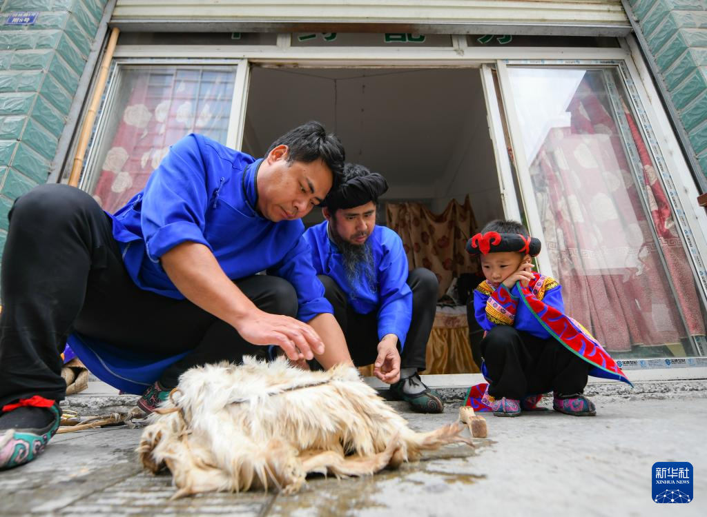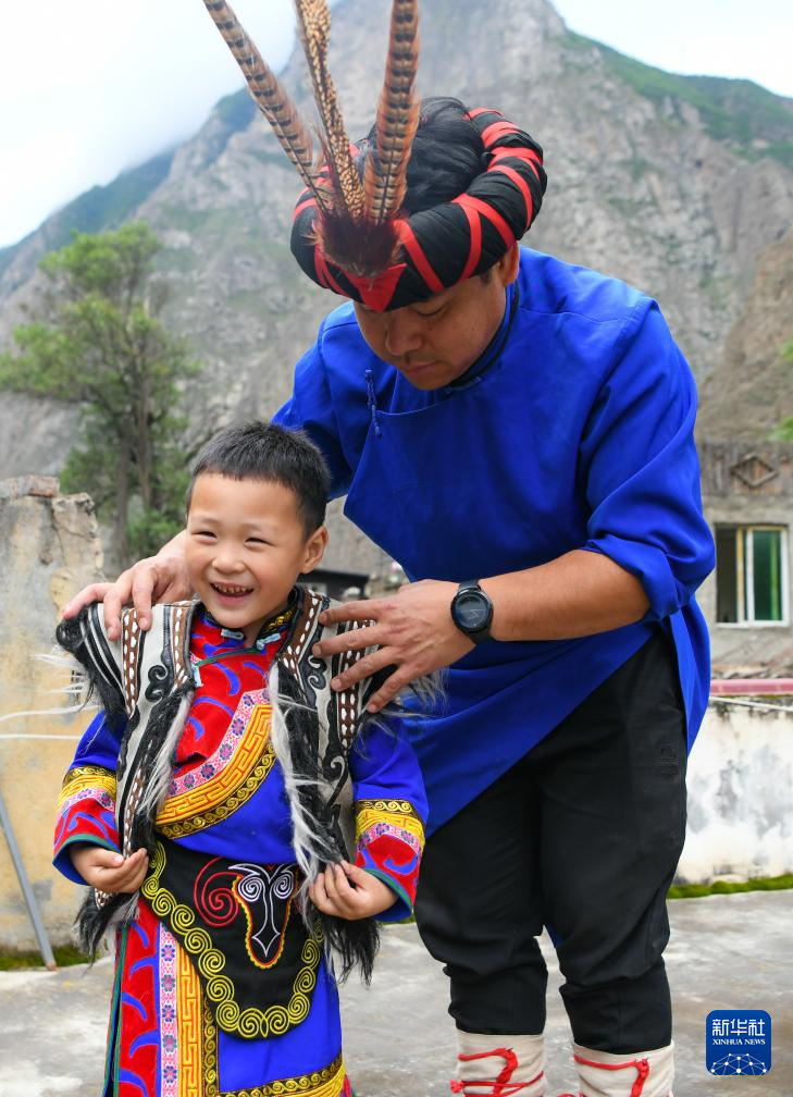 5月29日,在汶川縣灞州鎮聯合村,舅爺趙曉成為小耶格換上羌服和羊皮褂。