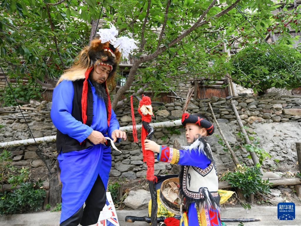 5月29日,在汶川縣灞州鎮聯合村,小耶格和舅爺趙俊成為練習羊皮鼓舞做準備。