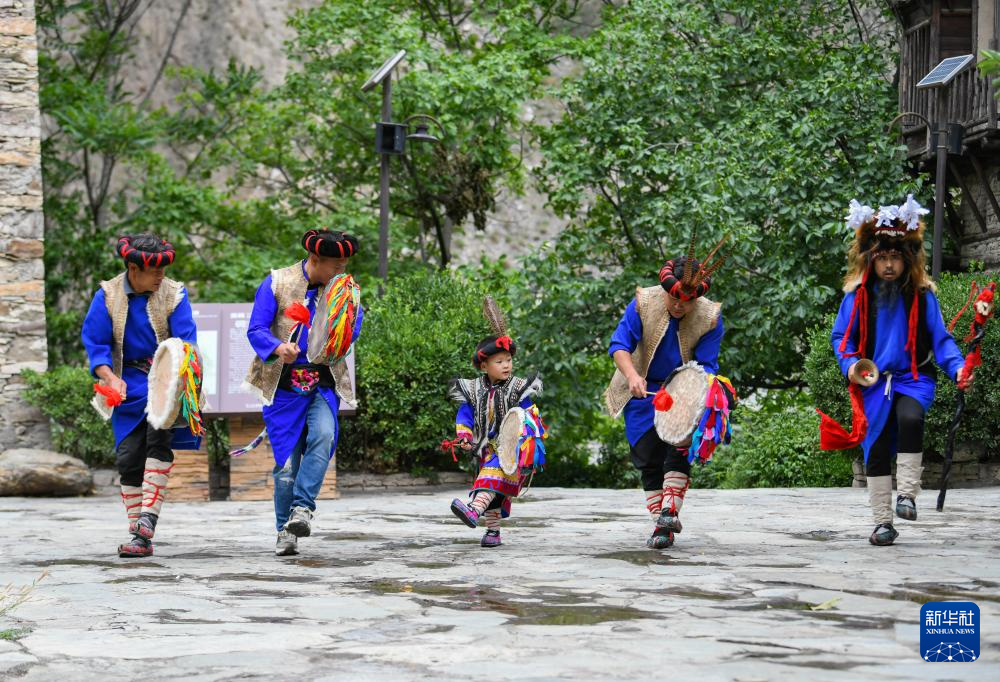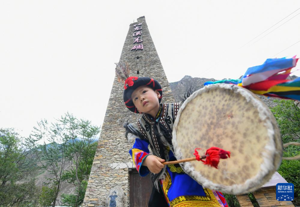 “嘣嘣嘣,嘣……”在四川省阿壩藏族羌族自治州汶川縣,羌山河谷中傳來一陣密集的鼓聲。站在寨子里的碉樓下,左手持鼓,右手執槌,拍鼓、甩腳、旋轉、吆喝……3歲萌娃小耶格有模有樣地和他的長輩們跳起羊皮鼓舞。