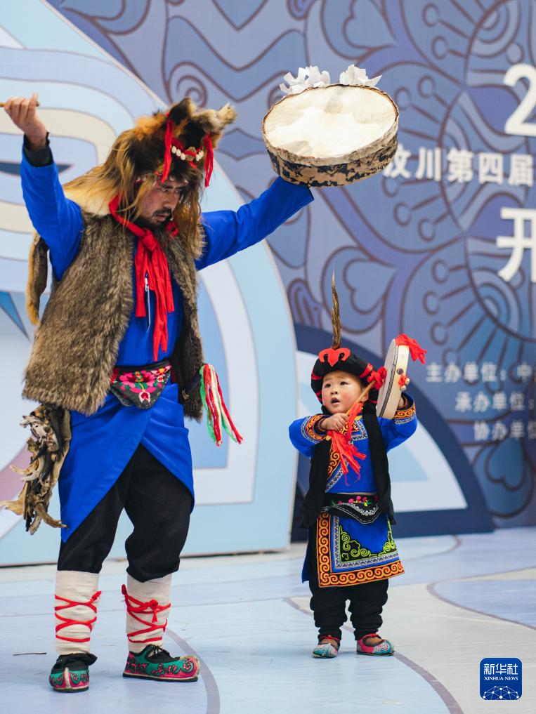 在汶川縣第四屆羌族傳統體育運動會上,小耶格和舅爺趙俊成表演羊皮鼓舞(2023年2月16日攝)。