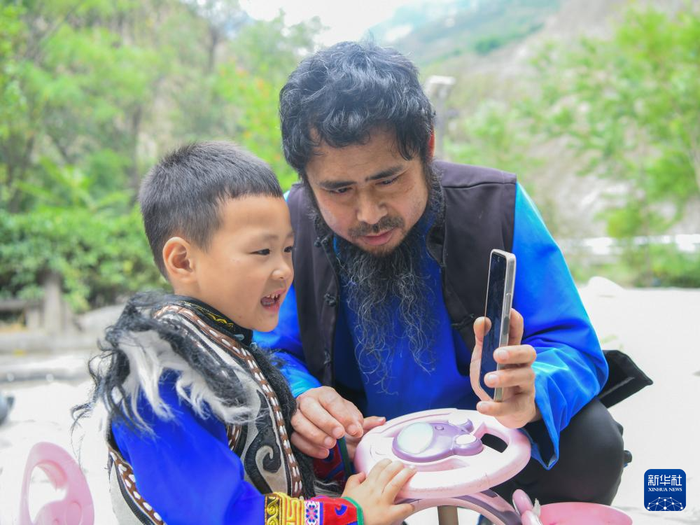 5月29日,在汶川縣灞州鎮聯合村,舅爺趙俊成給小耶格看用手機錄制的羊皮鼓舞視頻。