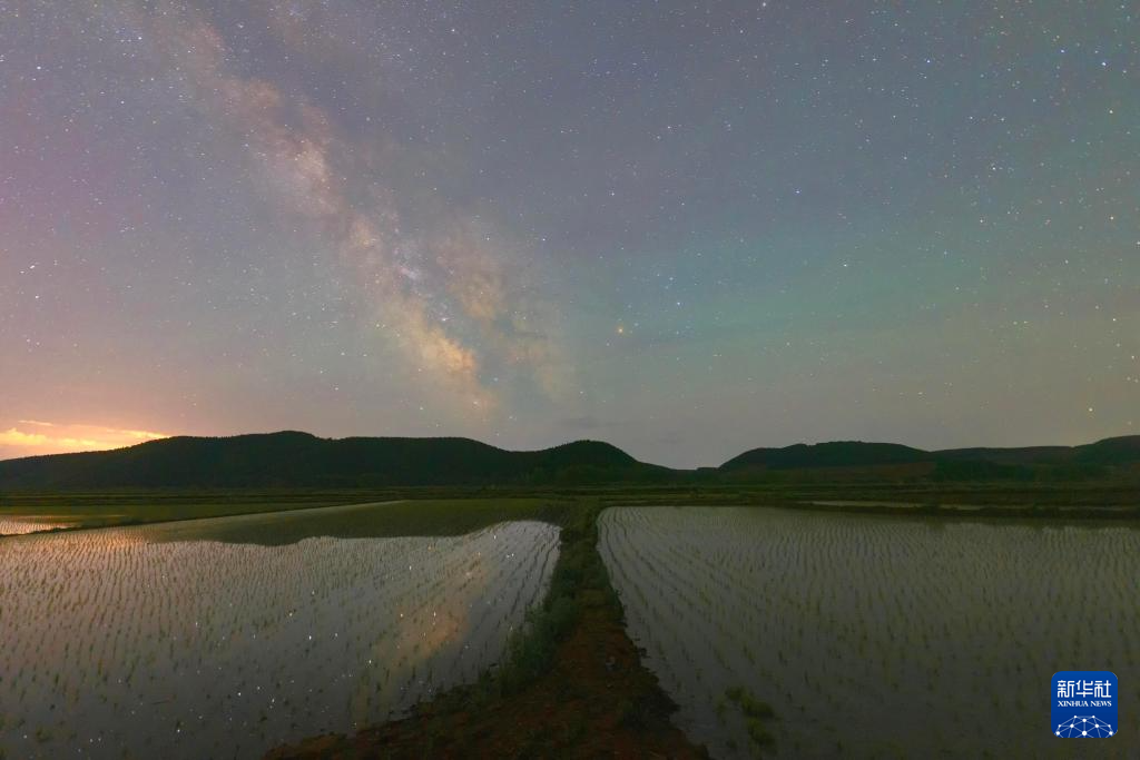 這是星空下的黑龍江省佳木斯富錦市萬畝水稻公園(6月2日攝)。