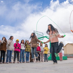 班戈縣中石化小學學生尼瑪措姆(右二)和同學們在操場上跳繩(6月22日攝)。