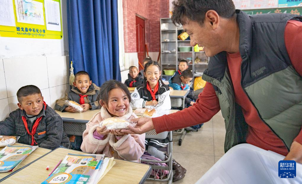 班戈縣中石化小學后勤副校長尼旦為學生們分發營養餐(6月22日攝)。