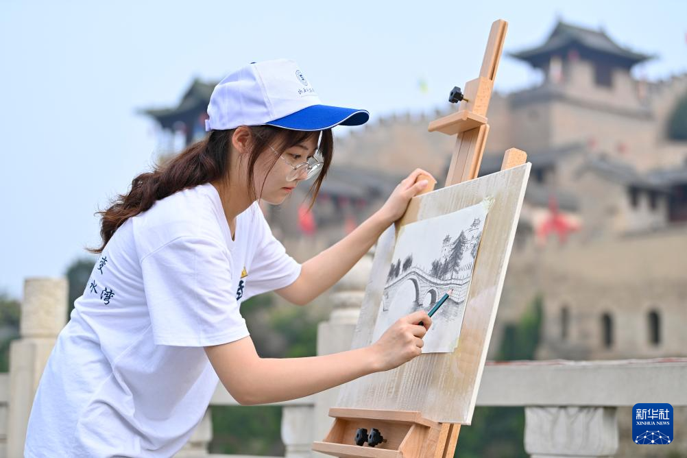 山西科技學院的學生在湘峪古堡寫生(7月10日攝)。