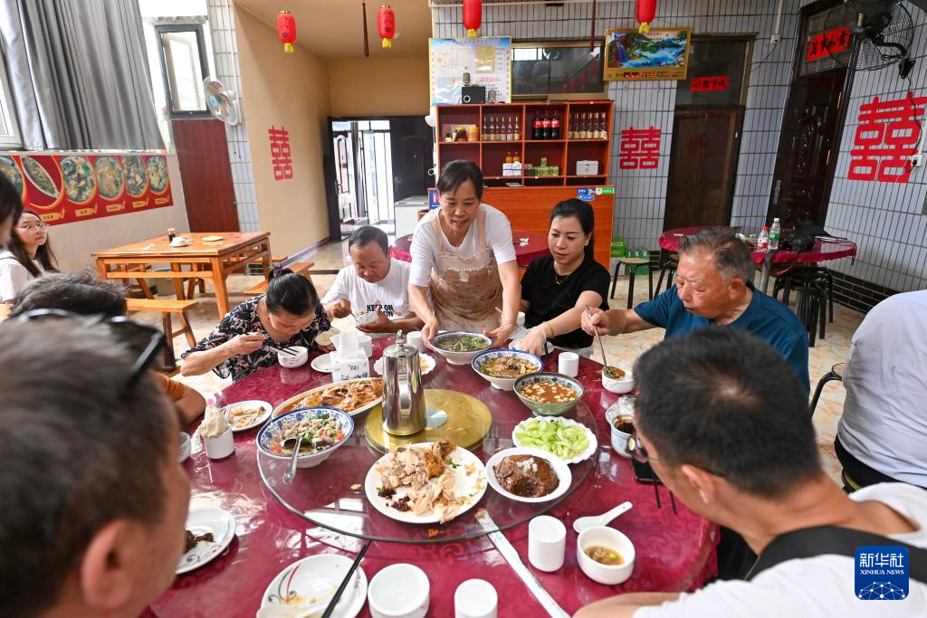 湘峪村村民連小霞在自家的農家樂為游客準備當地傳統的“八八宴”(7月9日攝)。
