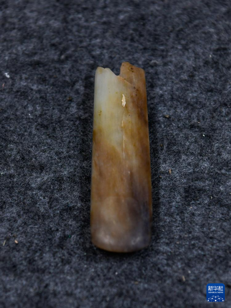 三星堆遺址發掘區出土的玉錐形器(4月27日攝)。