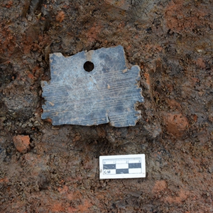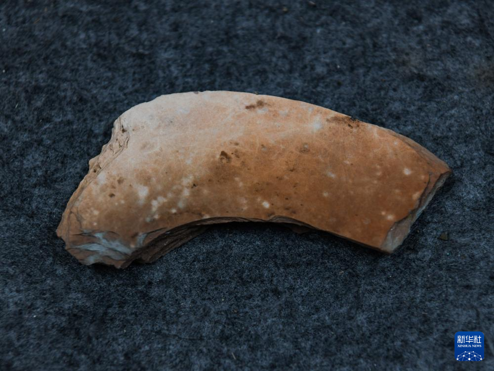 在四川省文物考古研究院拍攝的三星堆遺址出土的璧形器殘件(7月10日攝)。
