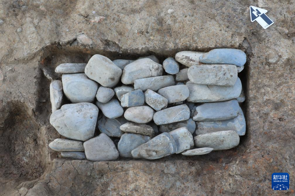 三星堆遺址發掘區出土的石圭(4月27日攝)。