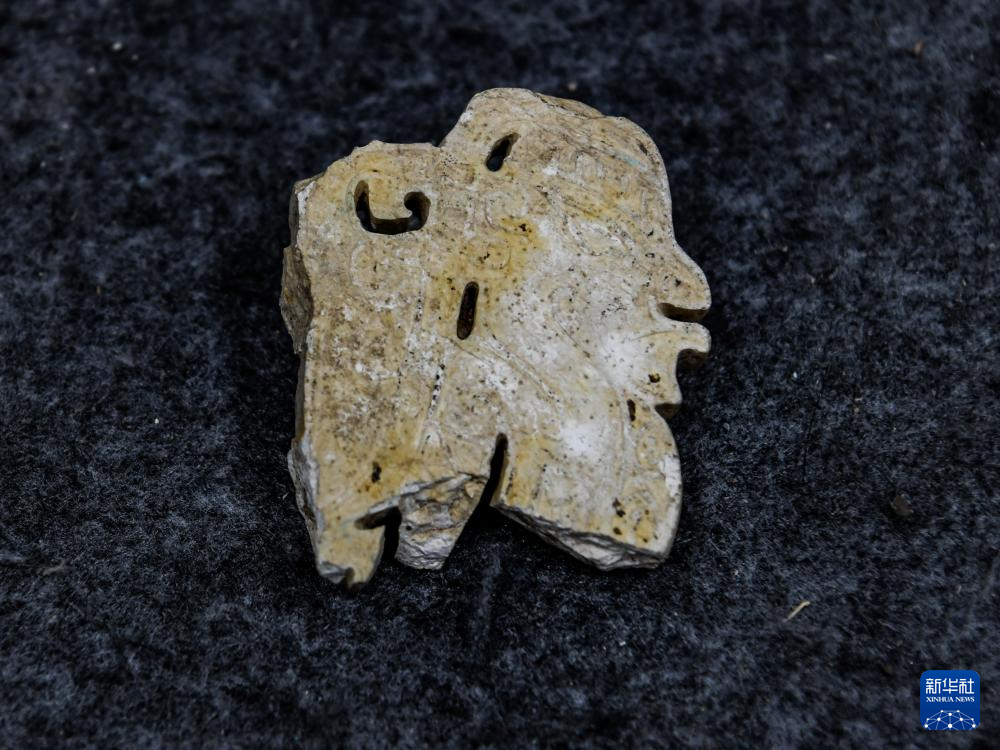 在四川省文物考古研究院拍攝的三星堆遺址出土的玉石上陽刻的側身人像(7月10日攝)。