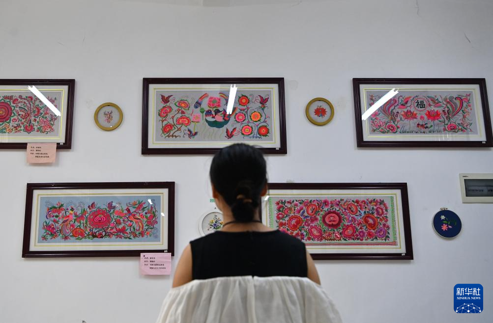 凌漫麗在田東縣義圩鎮七里刺繡基地展示她和村民制作的工藝品(8月20日攝)。