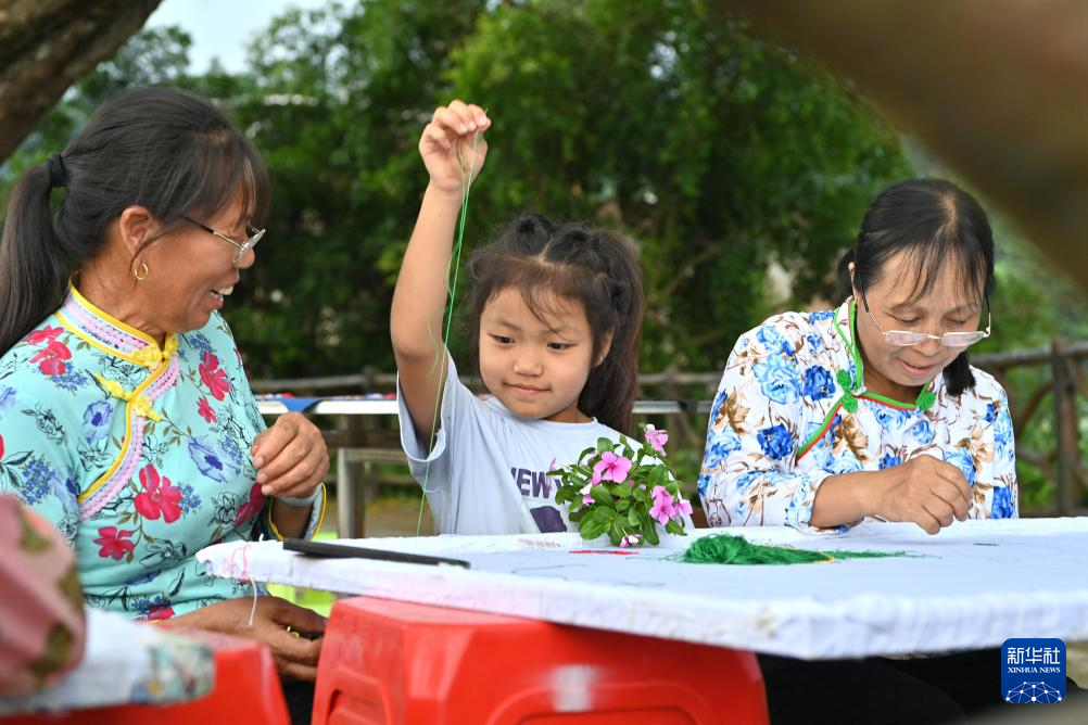 在田東縣義圩鎮朔晚村,一名小朋友在學習刺繡(8月20日攝)。