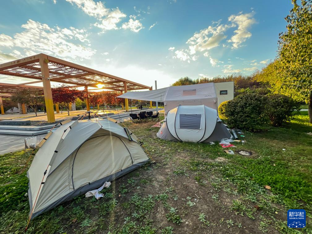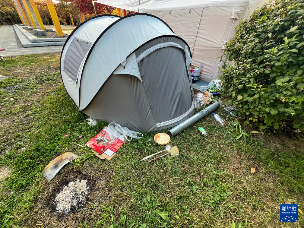 在吉林省長春市伊通河中段濱水綠道工業軌跡公園免費露營地,帳篷外散落著露營者野炊后留下的用品和垃圾,草坪還有被燒毀的痕跡(10月1日攝)。