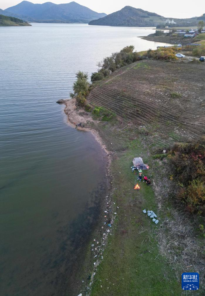 在吉林省吉林市松花湖岸邊,露營愛好者在搭建帳篷,垃圾散落在附近(10月2日攝)。