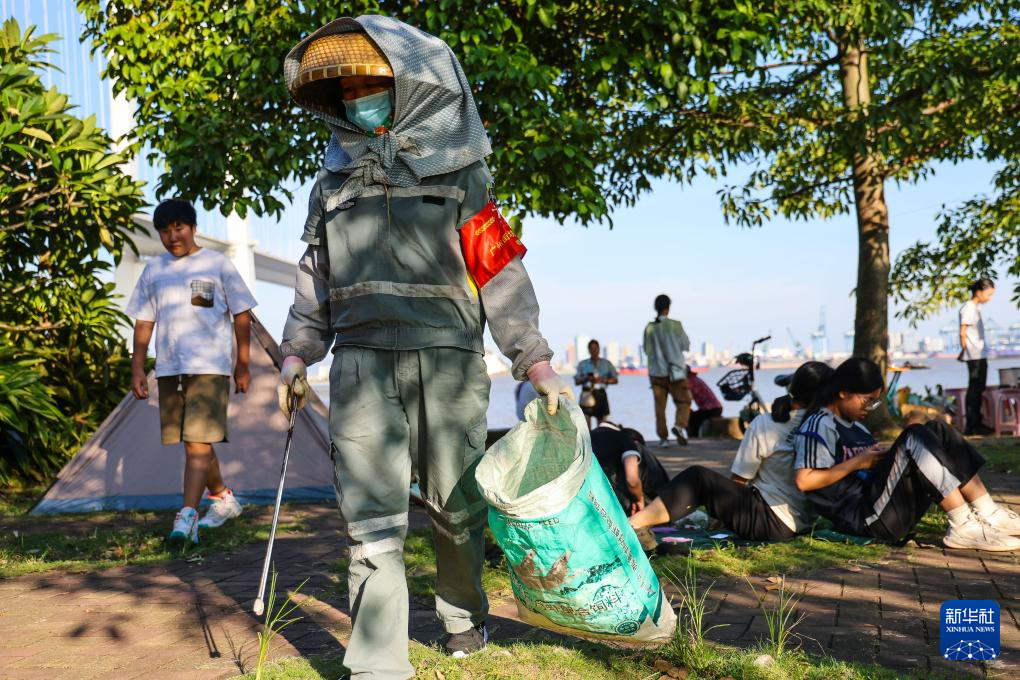 在廣東廣州番禺海鷗島露營地,環衛工人進行保潔工作(10月2日攝)。該露營點配備了保潔人員。當地出臺相關文件積極推動綠地開放,倡導“無痕露營”。