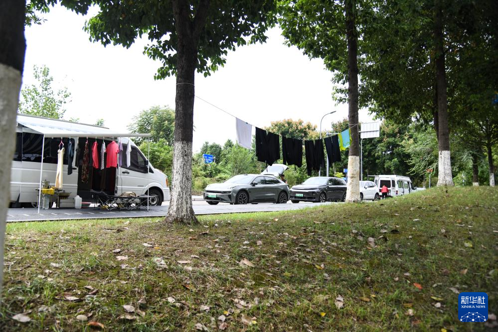 在四川成都新川之心公園,露營者將衣服晾在人行道邊(10月1日攝)。