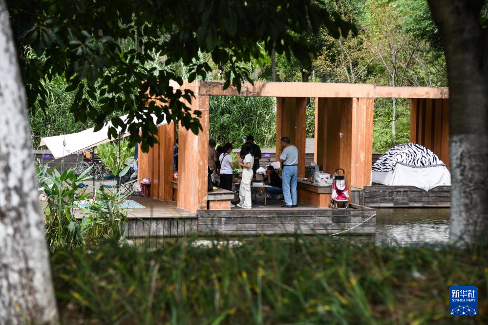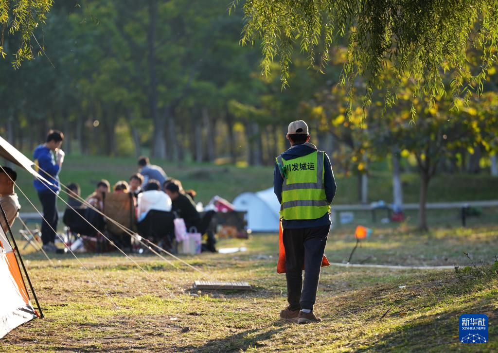 在四川成都新川之心公園,游客在屬于公共休息的區域露營(10月1日攝)。