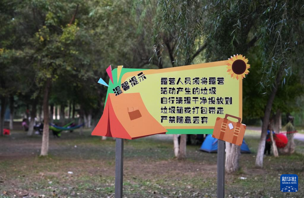 在遼寧沈陽一處露營地,樹立著提醒露營者自行清理垃圾的提示牌(10月4日攝)。
