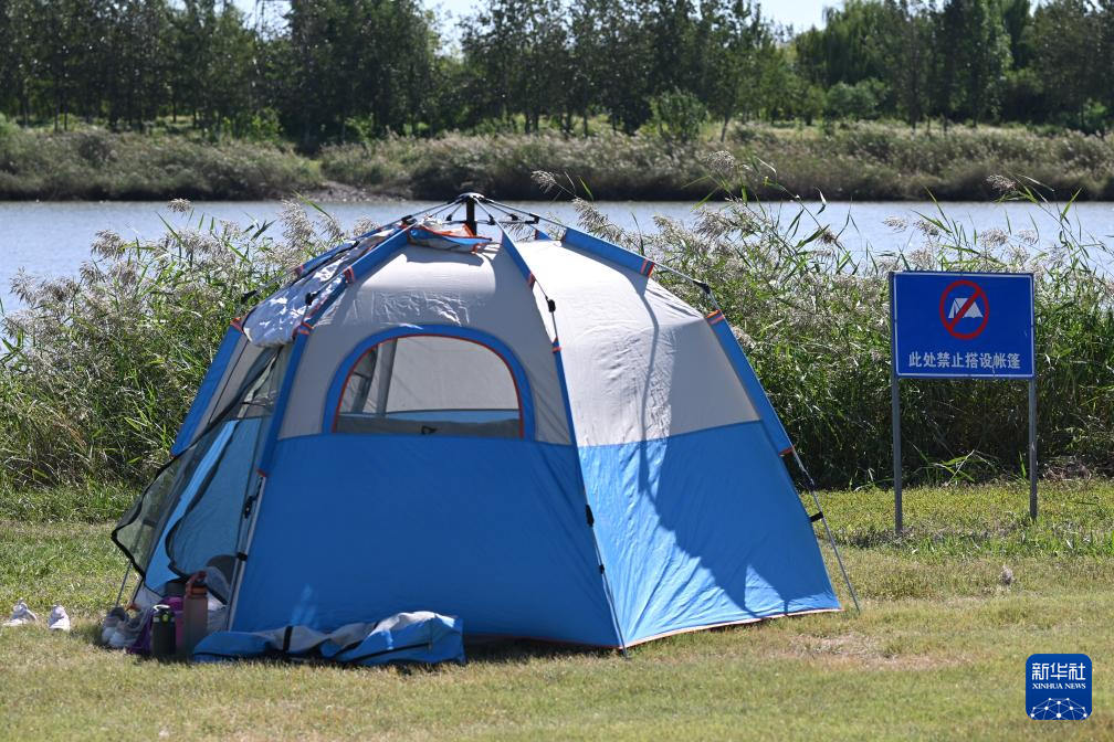 在天津某郊野公園,露營者將帳篷搭設在河道邊,旁邊有“此處禁止搭設帳篷”的提示牌(10月2日攝)。