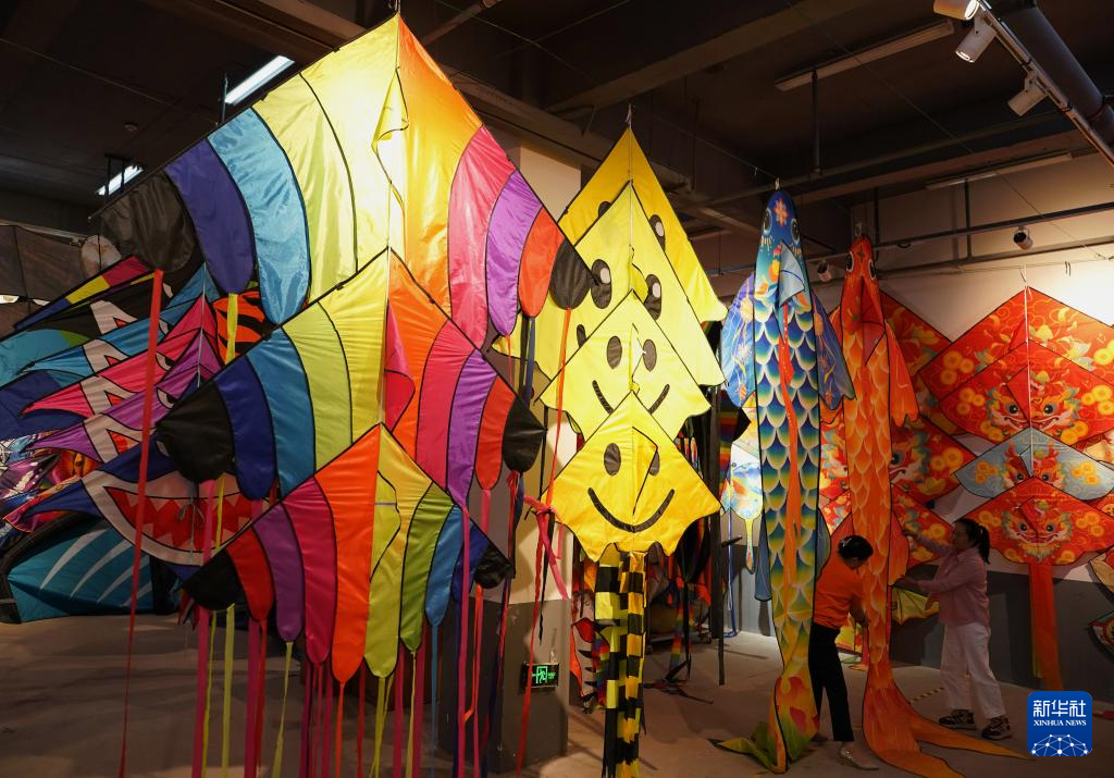 10月14日,在山東省濰坊市寒亭區的一家風箏生產企業,工作人員在展示風箏樣品。