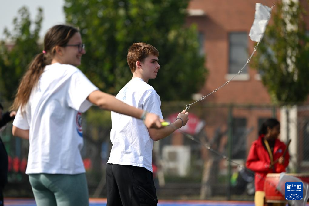 10月25日,“漢語橋”選手在天津霍元甲學校的操場上學習舞龍。