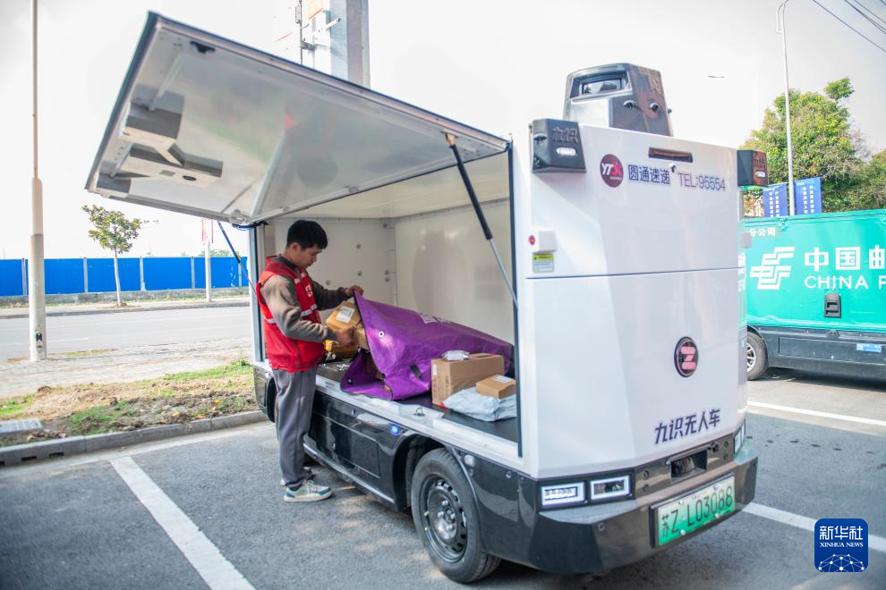 11月12日,在宿州青網科技園,快遞員將快遞包裹裝載到無人車中準備在園區內配送。