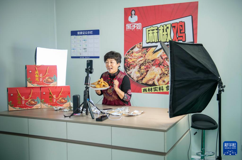 11月12日,在宿州青網科技園內的宿州市冠祥食品有限公司,工作人員通過直播平臺售賣麻椒雞產品。