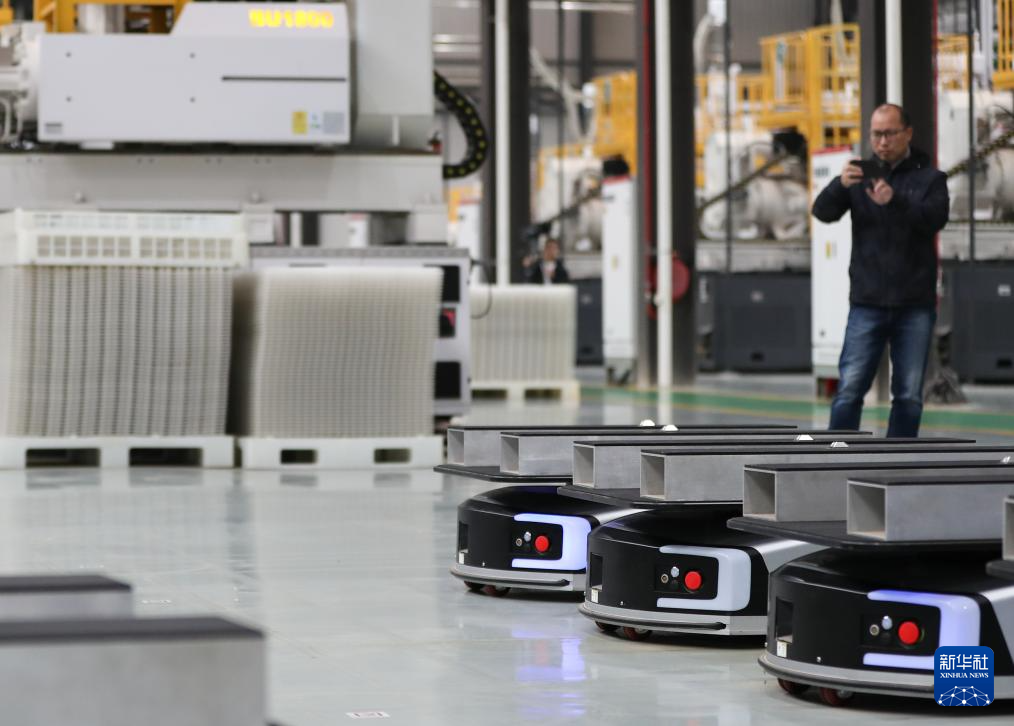 這是11月24日在雅士林長沙(國際)蠶桑絲綢智造產業園的注塑車間拍攝的用來搬運蠶具的自動導向車。