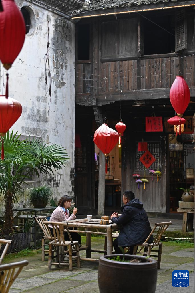 12月4日,在浙江省金華市浦江縣虞宅鄉新光村,游客在一家青年創客咖啡吧內休閑。