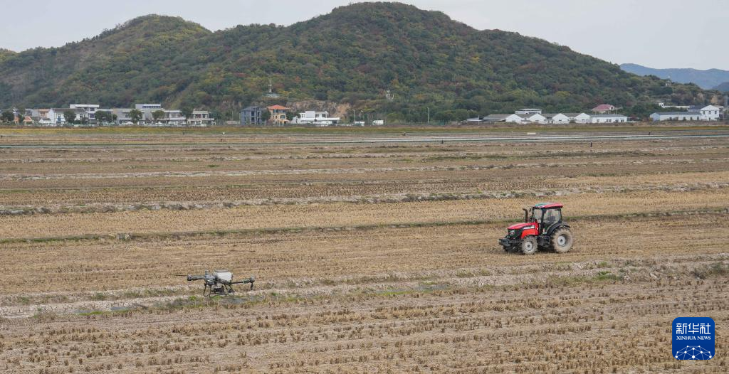 12月4日,植保無人機和無人駕駛拖拉機在岱山現代農業產業園的田地里作業。