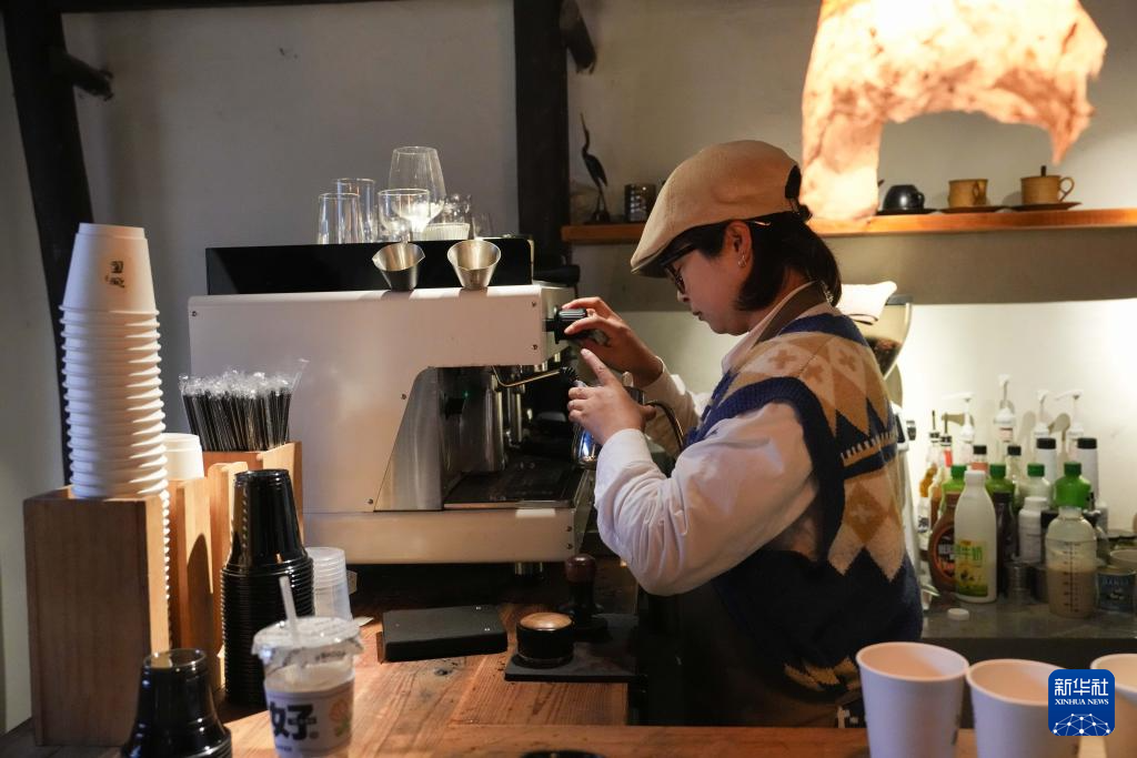 12月5日,咖啡店員在浙江寧波南陽自然村南陽福園制作咖啡。