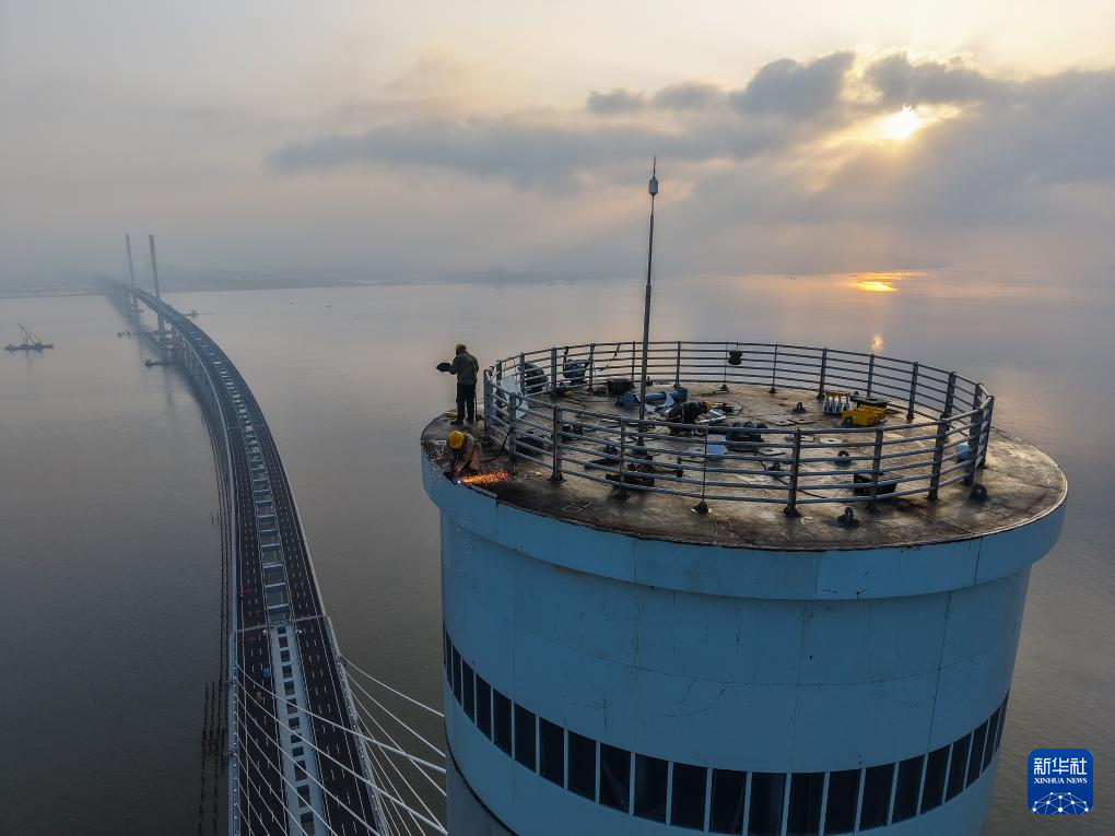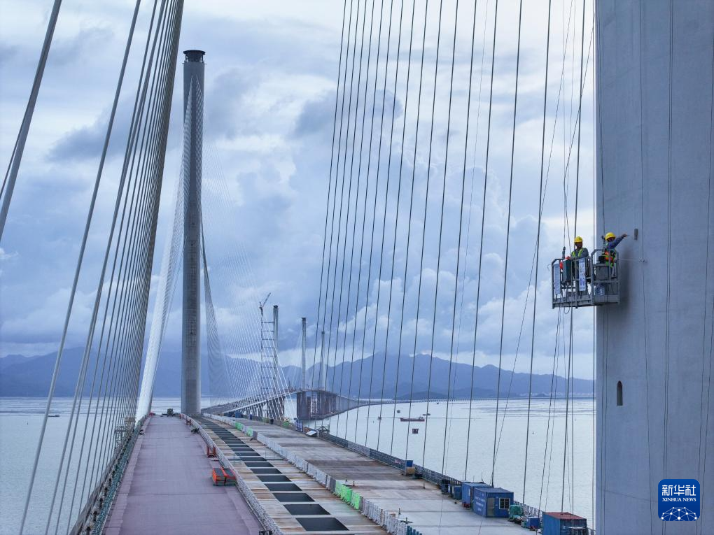 2024年7月16日,施工人員在黃茅??绾Mǖ栏邫诟鄞髽驏|索塔進行涂裝前清理(無人機照片)。