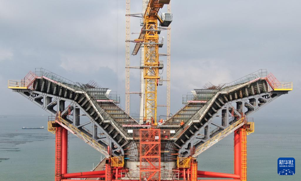 2022年6月28日,黃茅海大橋東塔第十二節爬模爬升到位,進入中部塔柱施工階段(無人機照片)。