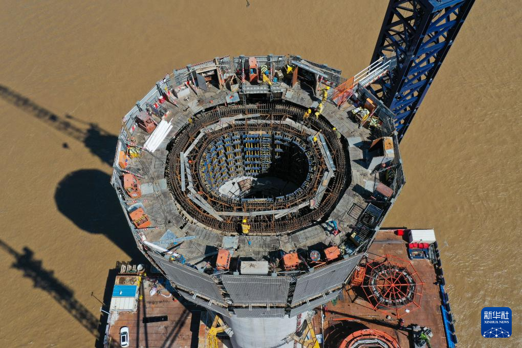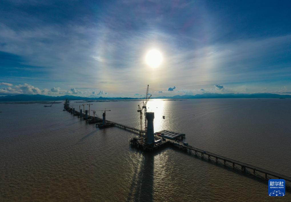2023年4月17日,施工人員在黃茅??绾Mǖ傈S茅海大橋進行墩柱基樁建設(無人機照片)。