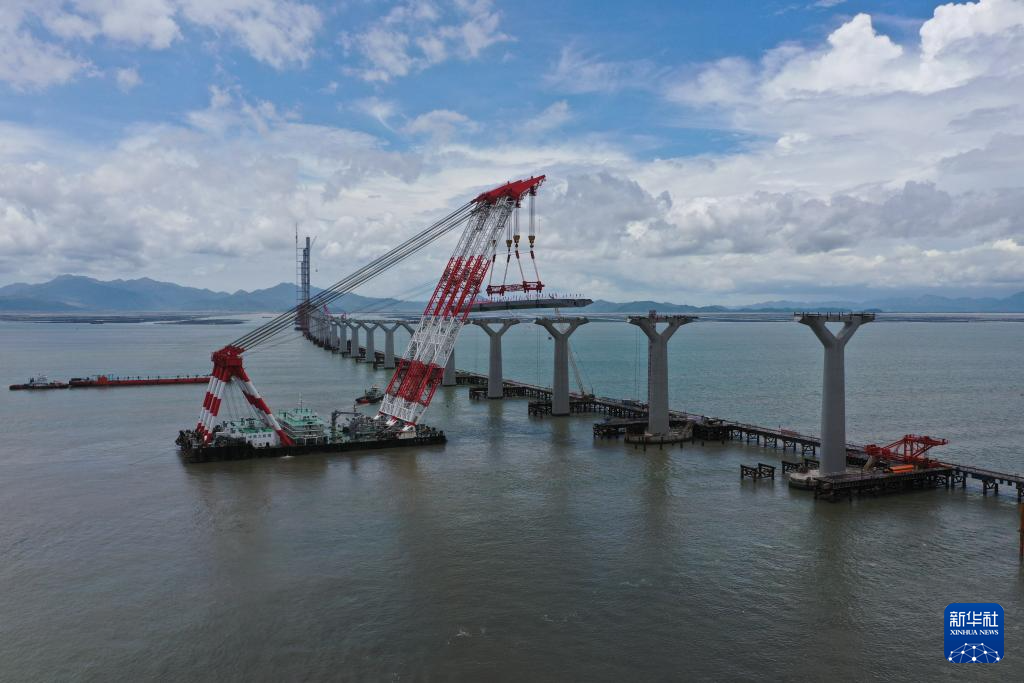 2023年8月12日,黃茅??绾Mǖ乐幸龢蚴讉€大節段鋼梁使用“大橋海鷗”號起重船進行吊裝作業(無人機照片)。